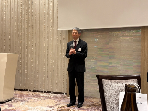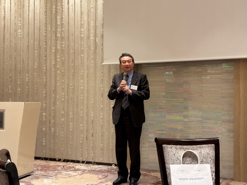 続いて、 中北英一 総長特別補佐・名誉教授の来賓挨拶があり、京友会事務局からの報告では、田中一成 氏(医学部・1975年卒)が会長職を引き継ぐことと、静岡県出身の現役学生(在学生)も本同窓会の会員になれる仕組みが提案され、審議の結果、全会一致で承認されました。
