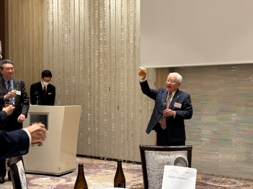 総会に引き続き行われた懇親会は、志田洪顯 元会長(工学部・1969年卒)の乾杯の発声で始まりました。京都大学同窓会事務局からの報告や、初参加者の会員の紹介が行われ、学部や年代を超えた同窓生が和気藹々とした雰囲気の中、交流を深めました。